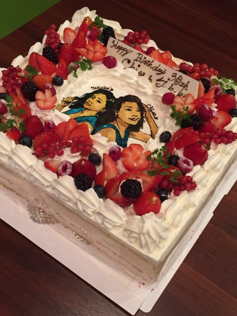 パーティー用に2人の似顔絵を入れたケーキです!絵は少量のチョコレートと生クリームで描いております!